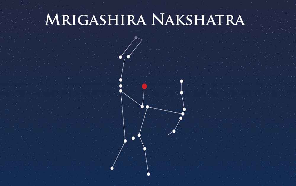 Mrigashira Nakshatra Mrigashira is considered as the fifth Nakshatra or birth star in the zodiac. It is located on the right shoulder of Orion. Mrigashira represents the shape of a deer\'s head. Taurus and Gemini connecting the Mrigashira Naksh...