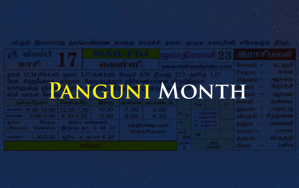 Panguni Month According to the Hindu custom, Panguni month is considered as the last month of Tamil calendar. It falls on Uttara-Phalguni in the month of Panguni. The main significance of Panguni month is the full moon day coincides with...